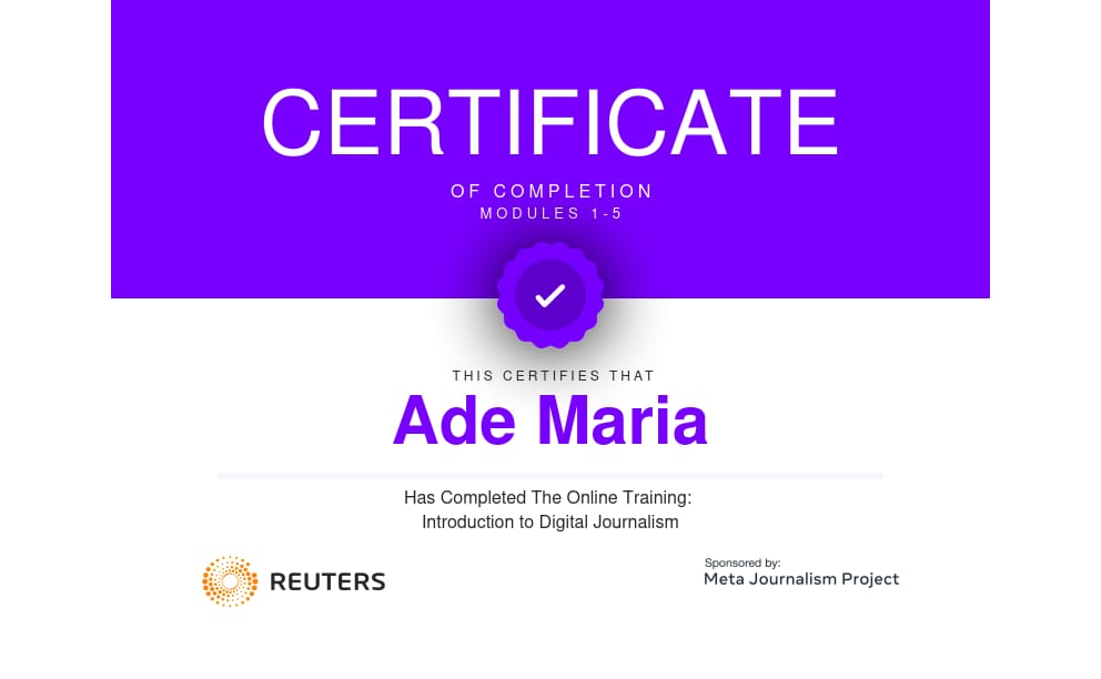 Jakarta- Berikut nama Dosen dan Mahasiswa Konsentrasi Ilmu Jurnalistik Program Studi Ilmu Komunikasi Fakultas Ilmu Komunikasi Universitas Jayabaya yang telah berhasil menyelesaikan sesi Online Training Digital Journalism di Kantor Berita Reuters :