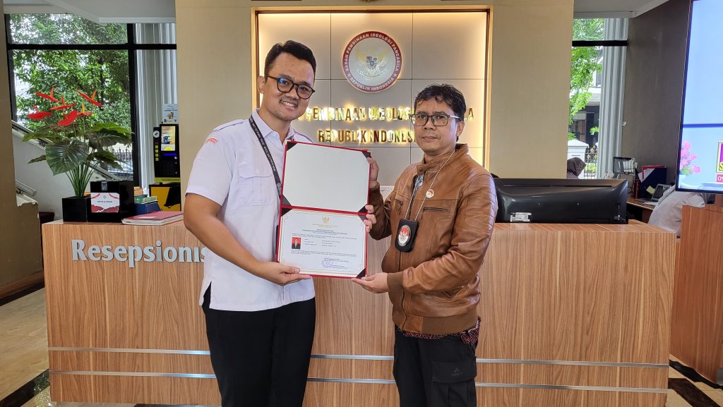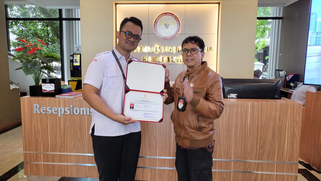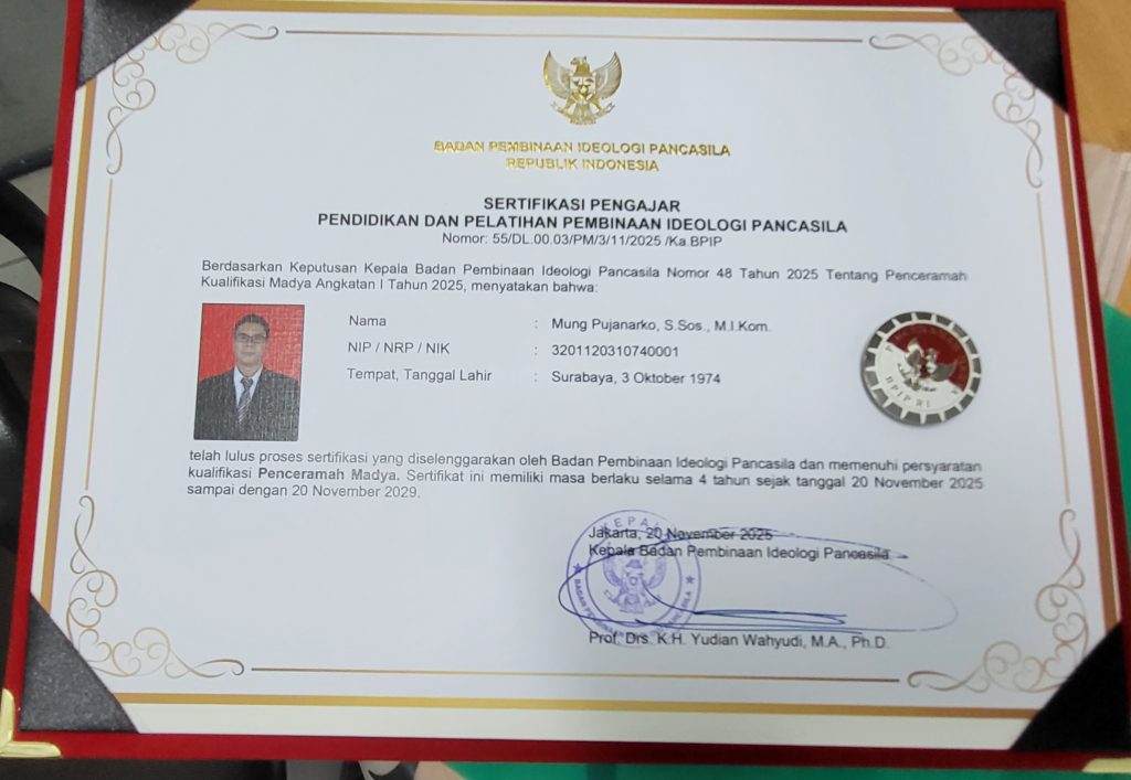 Sertifikasi Pengajar Pendidikan dan Pelatihan Pembinaan Ideologi Pancasila ini resmi diberikan berdasarkan Keputusan Kepala Badan Pembinaan ldeologi Pancasila Nomor 48 Tahun 2025 Tentang Penceramah Kualifikasi Madya Angkatan I Tahun 2025, menyatakan bahwa : Mung Pujanarko, S Sos., M.I.Kom telah lulus proses sertifikasi yang diselenggarakan oleh Badan Pembinaan ldeologi Pancasila dan memenuhi persyaratan kualifikasi Penceramah Madya.
