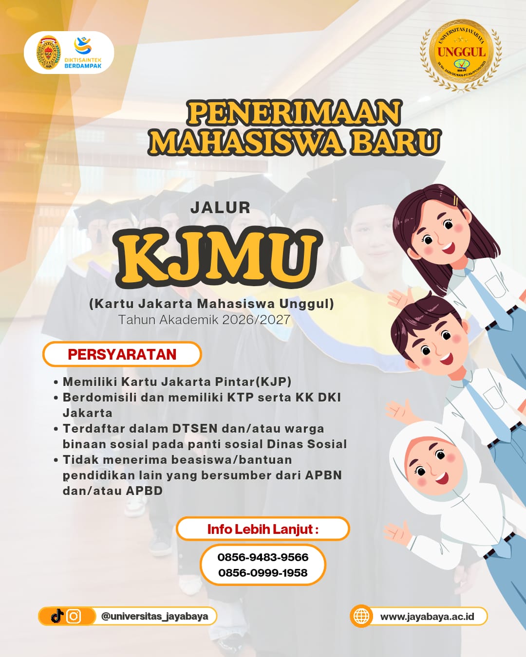 Jakarta – Universitas Jayabaya (terakreditasi Unggul) membuka pendaftaran mahasiswa baru tahun akademik 2026/2027 dengan menerima jalur beasiswa Kartu Jakarta Mahasiswa Unggul (KJMU) dan KIP Kuliah.